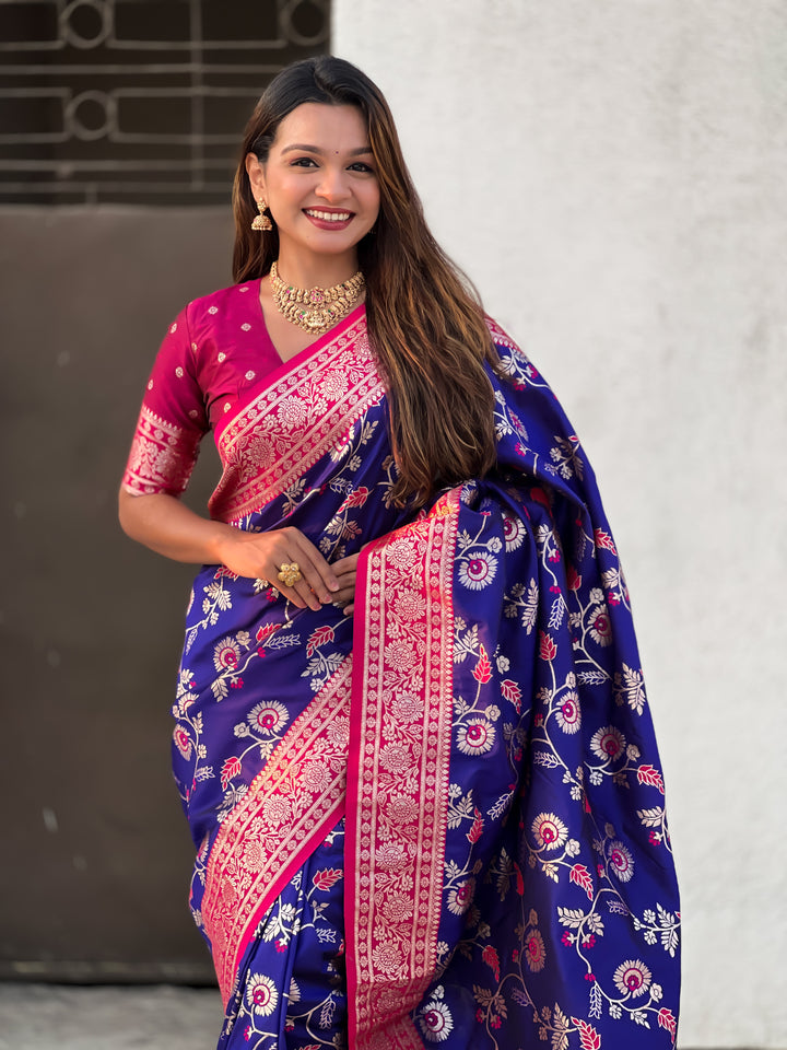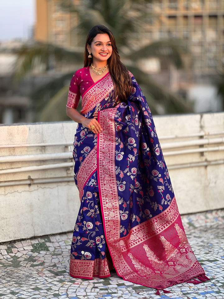A Banarasi saree is one of the most exquisite and traditional forms of sarees from Varanasi (Banaras), India. Known for their rich silk fabric, intricate brocade (zari) work, and timeless elegance, Banarasi sarees are often considered heirloom pieces, passed down through generations.