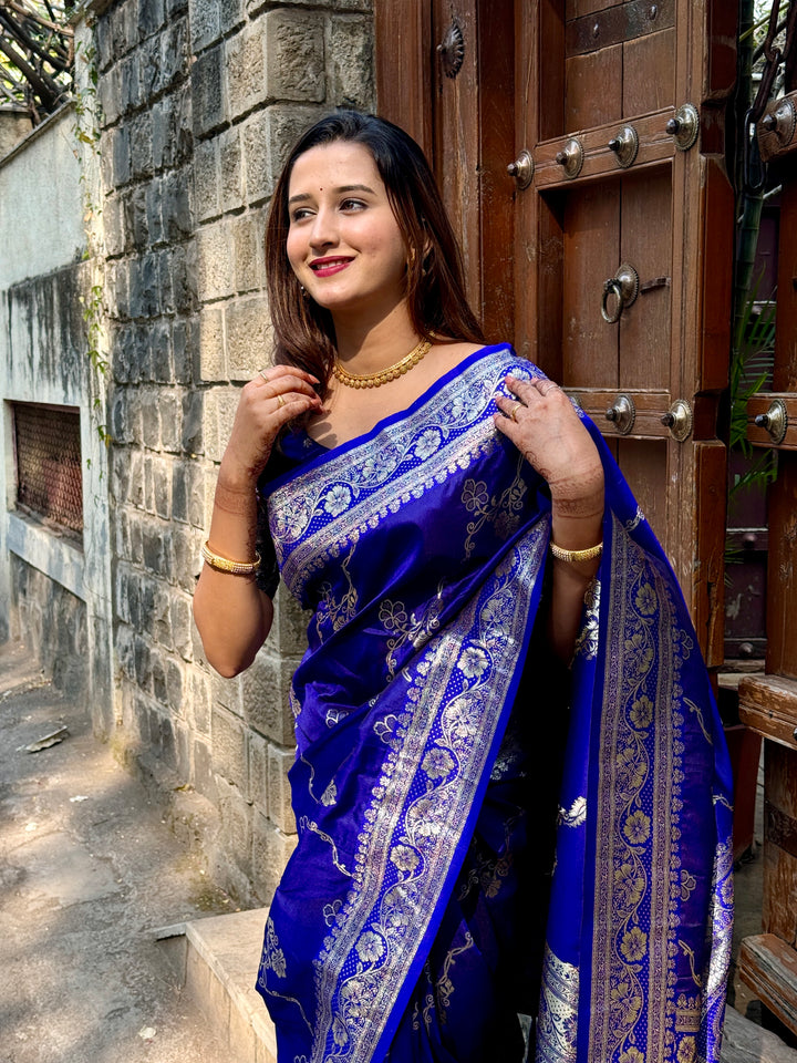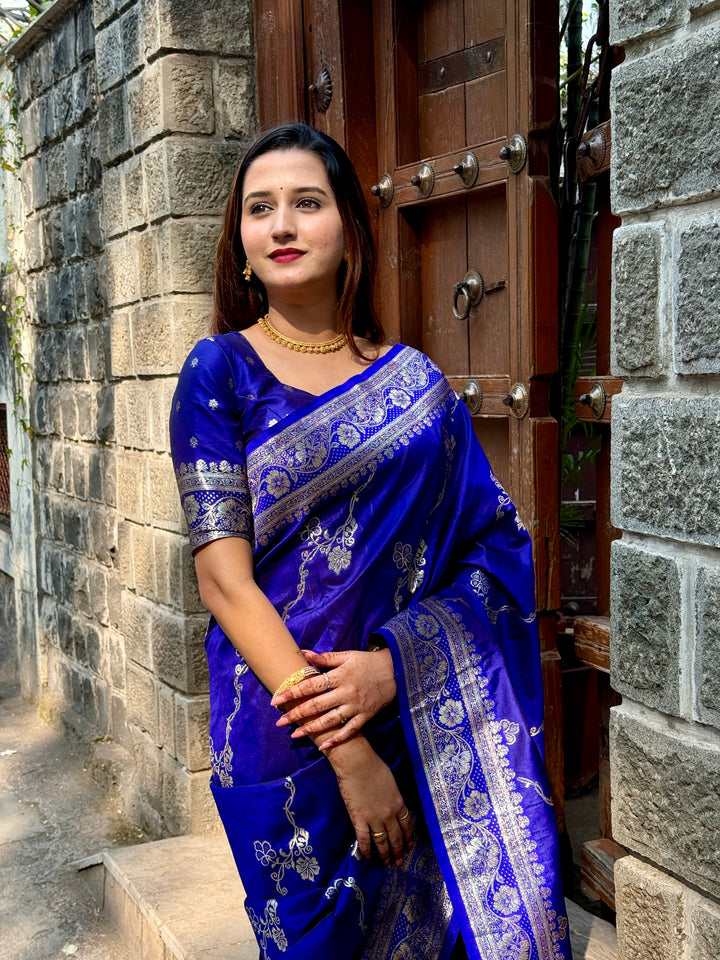 Blue Partywear Banarasi Soft Silk Saree With Unstitched Blouse