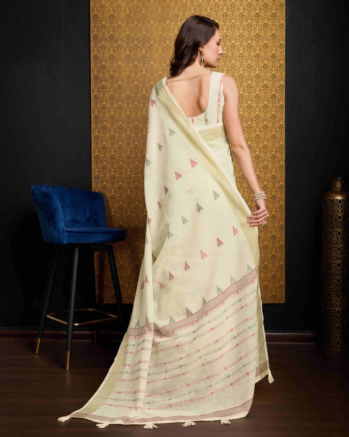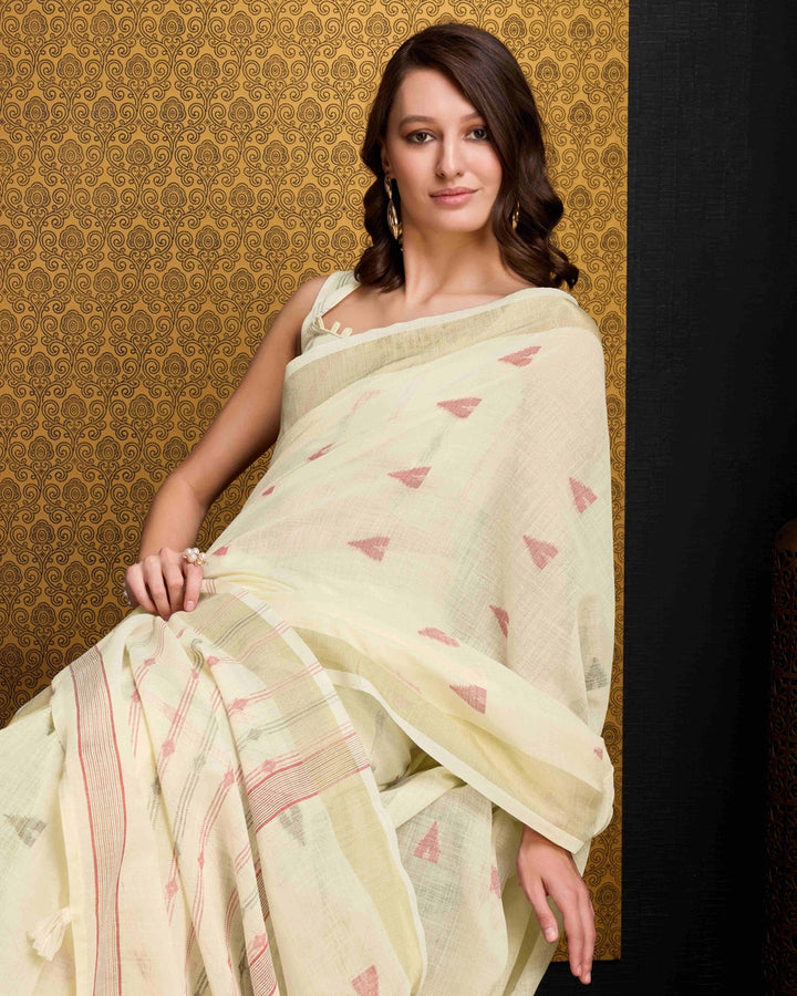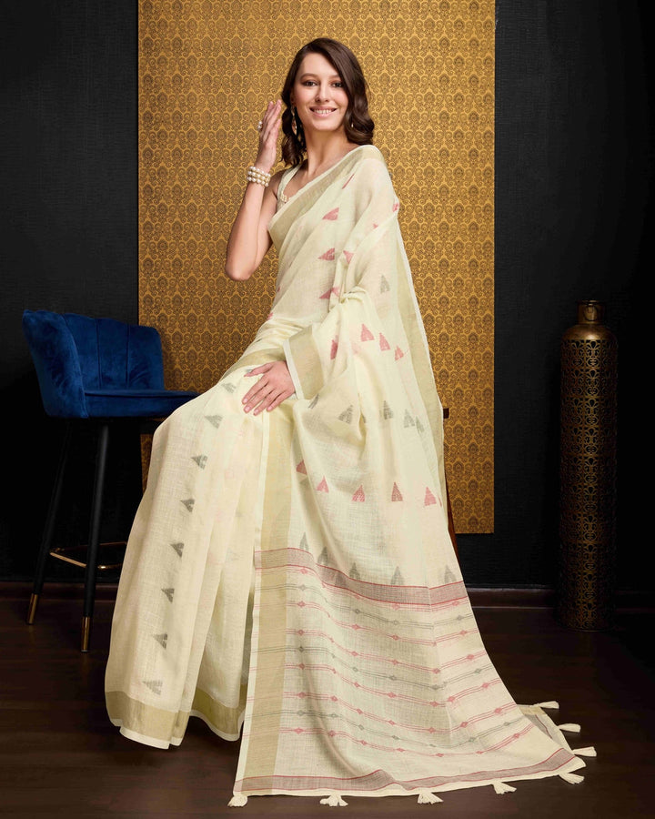 Crisp texture: The fabric has a natural stiffness that holds its shape well and adds a structured, elegant drape to the saree.