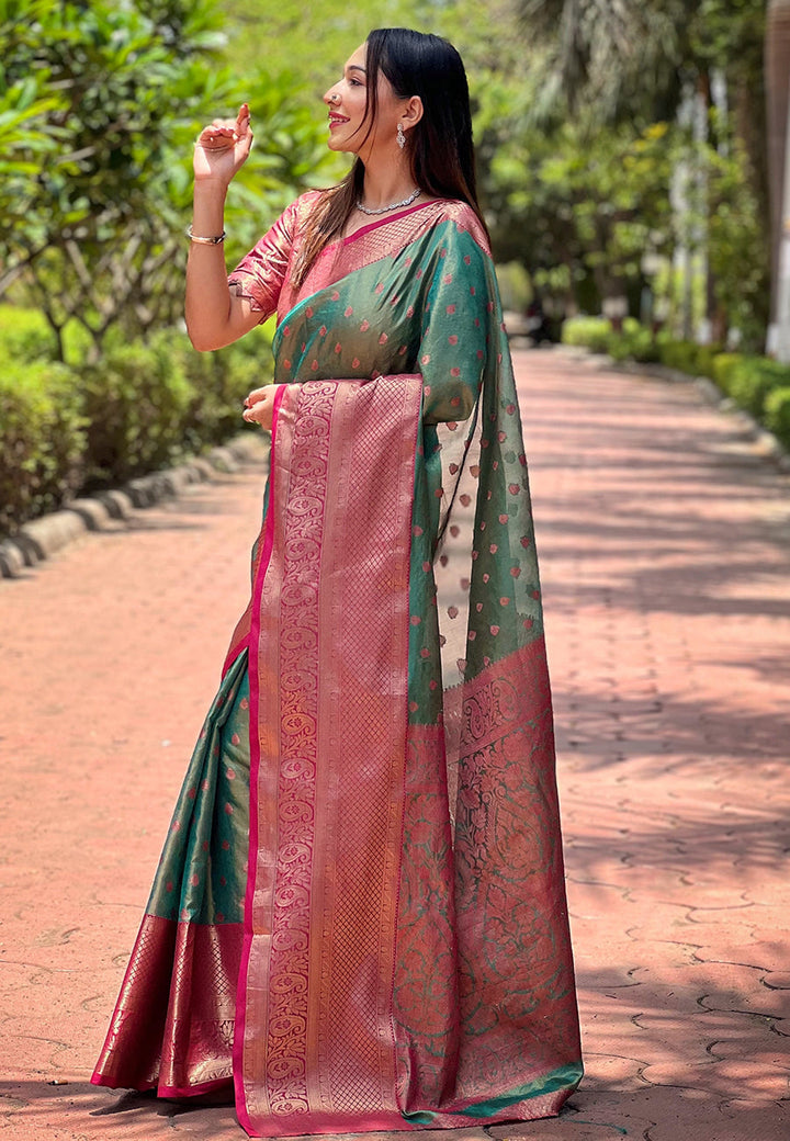 Expertly handcrafted in the traditional South Indian town of Kanchipuram, this tissue silk saree features delicate contrast motifs and a stunning gold zari woven contrast border. The rich gold zari woven pallu adds to its luxurious look. Complete the ensemble with the matching zari woven brocade blouse.