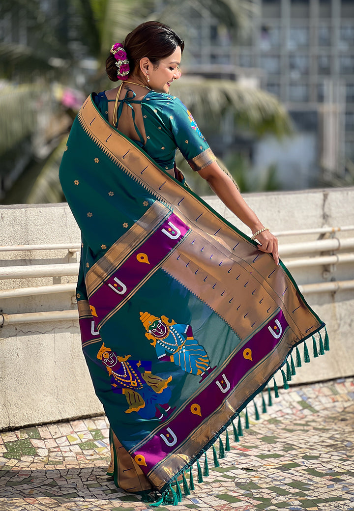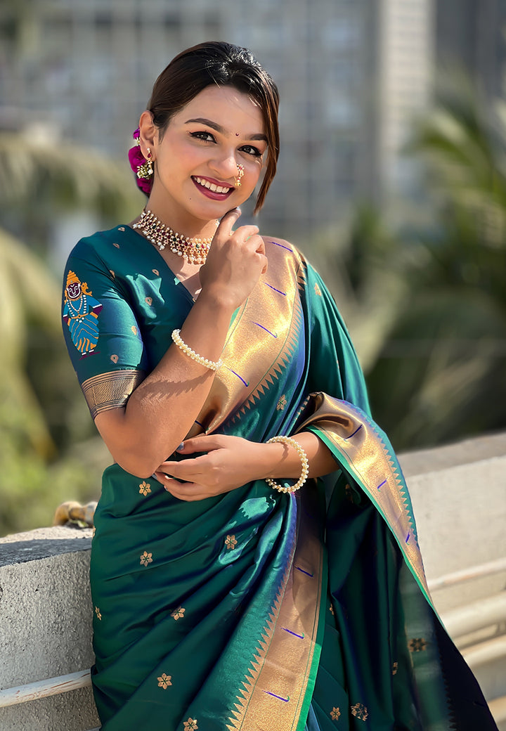 Soft Silk sarees with floral motifs weaves all over the body having Rich woven Paithani Vitthala pallu and muniya paithani border paired with brocade blouse same as shown.