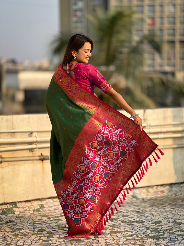 Pure Tissue Zari Woven sarees with gold zari woven motifs all over the body and contrast woven border. Rich woven Patola meenakari Pallu Paired with Brocade contrast blouse same as shown in Image.