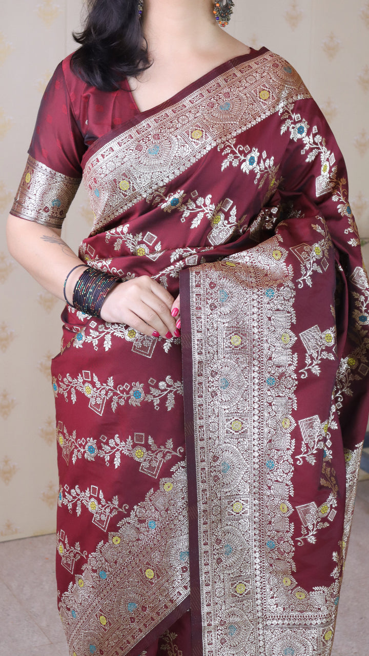 Maroon Banarasi Soft Silk Saree With Unstiched Blouse