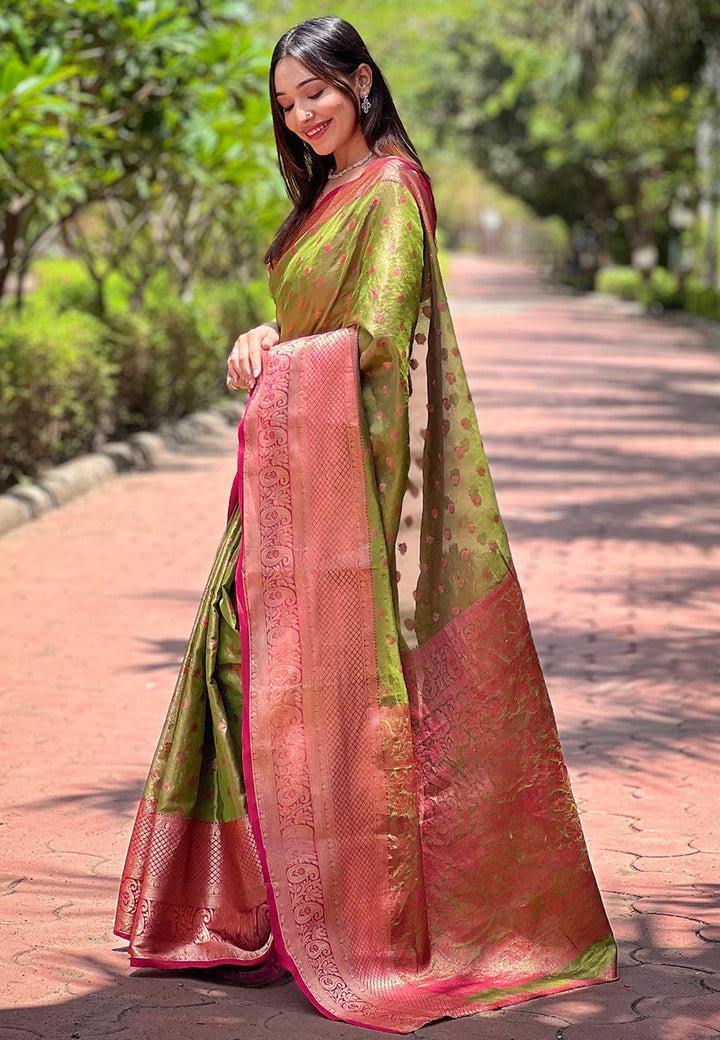 Expertly handcrafted in the traditional South Indian town of Kanchipuram, this tissue silk saree features delicate contrast motifs and a stunning gold zari woven contrast border. The rich gold zari woven pallu adds to its luxurious look. Complete the ensemble with the matching zari woven brocade blouse.