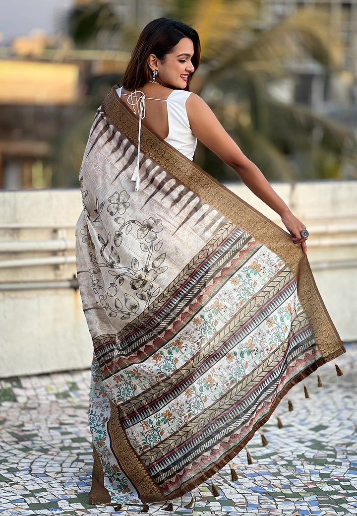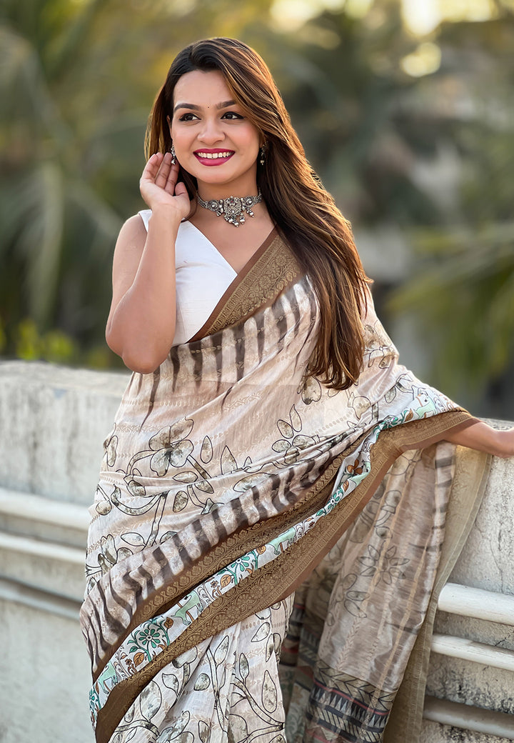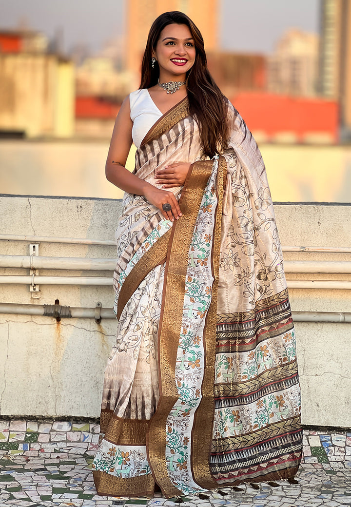 Combines the traditional Chanderi weave with a crushed texture. Soft, airy, and semi-sheer, this saree features light zari work and patterns. Known for its easy drape and contemporary appeal.