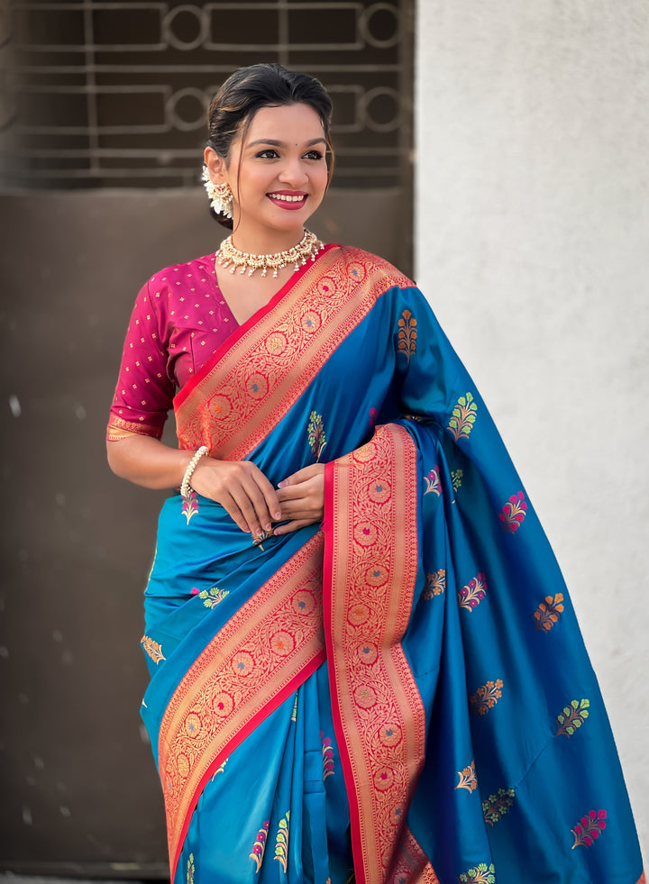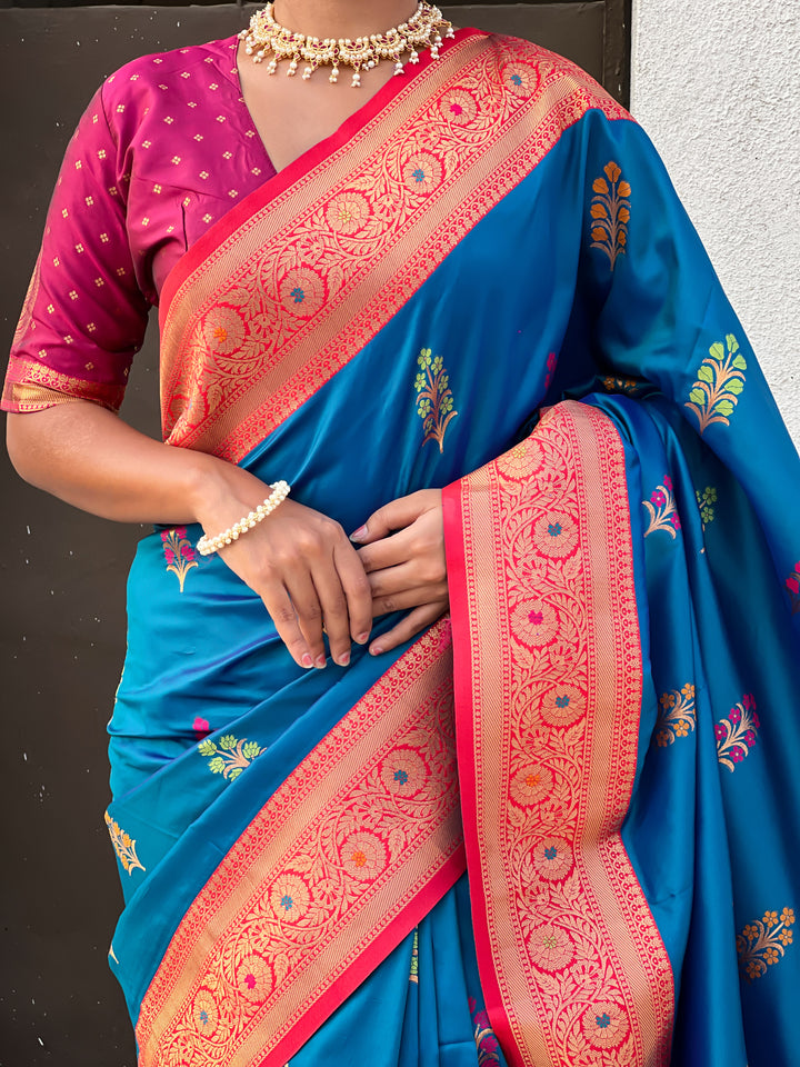 A soft silk flower butta saree is a charming and graceful saree made from soft silk, decorated with delicate buttas (small floral motifs) woven or embroidered across the body of the saree. It's perfect for someone who loves a mix of tradition and subtle beauty.