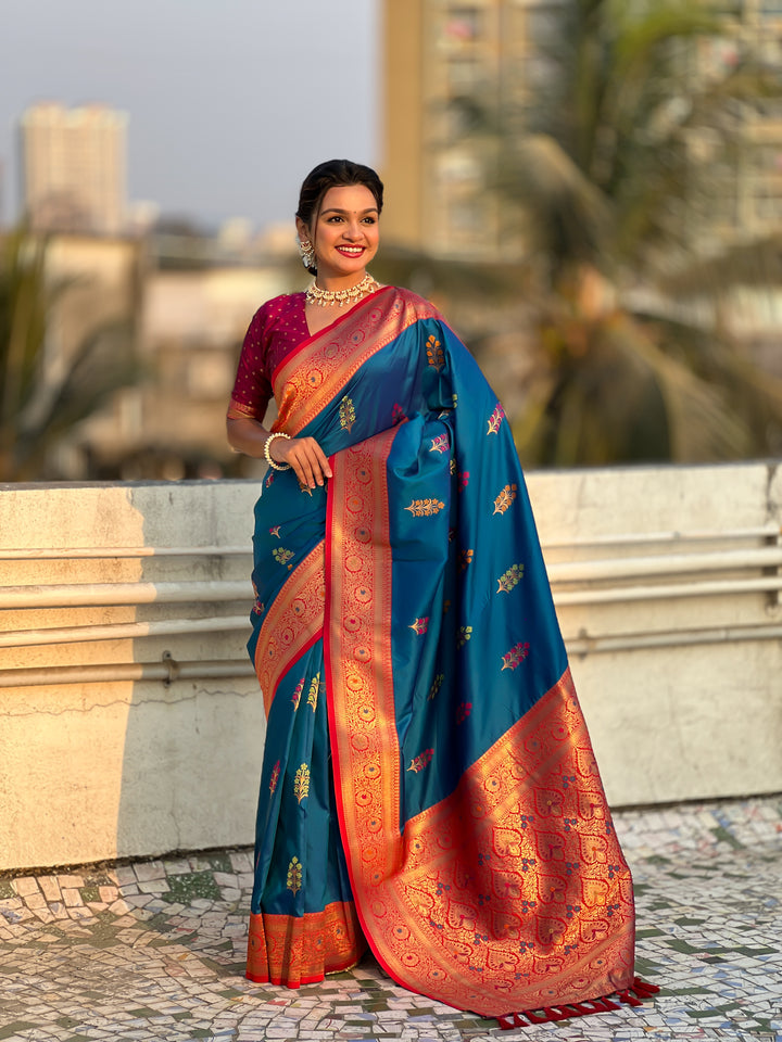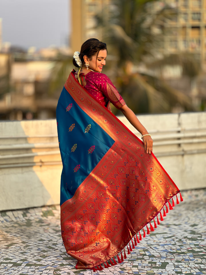 Flower Butta Design: Scattered floral motifs (buttas) all over the saree give it a minimal yet elegant appeal—can be woven in zari or colorful threads.