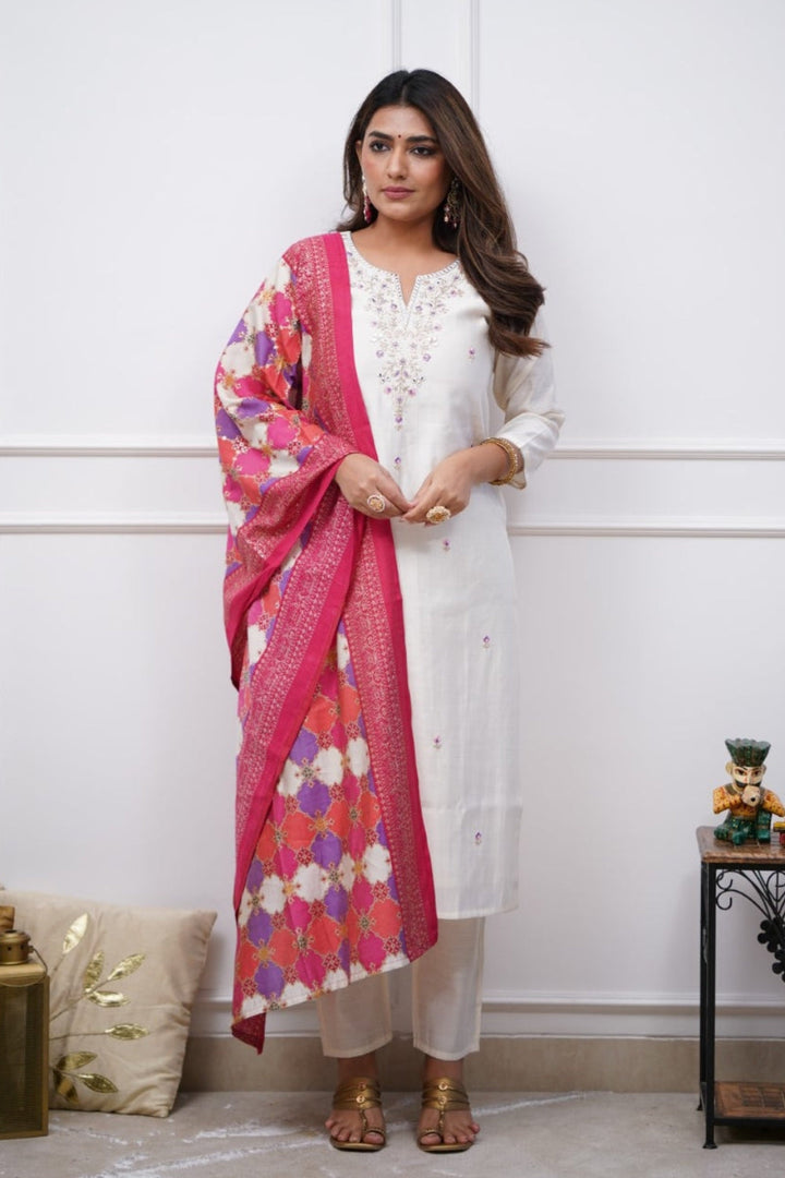 White Fancy Chanderi Salwar Suit With Dupatta Set