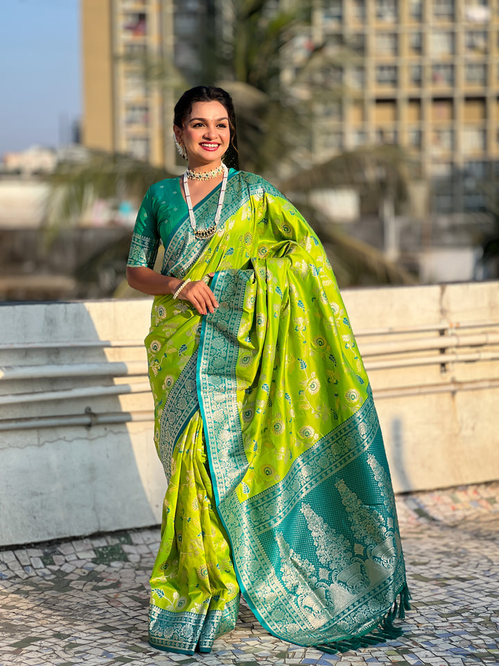 Parrot Green Banarasi Saree With Unstiched Blouse