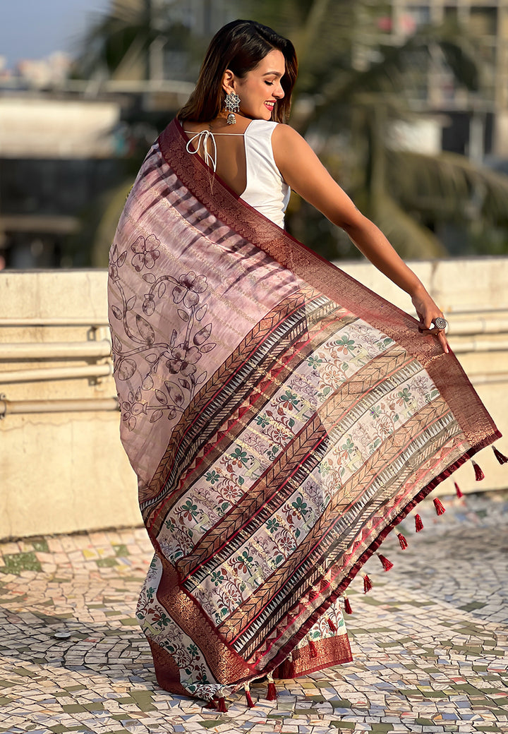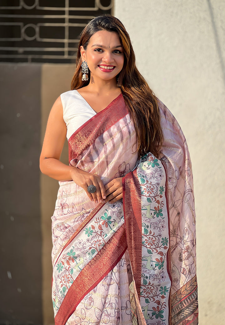 Combines the traditional Chanderi weave with a crushed texture. Soft, airy, and semi-sheer, this saree features light zari work and patterns. Known for its easy drape and contemporary appeal.