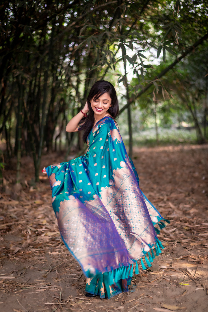 Made from the rare and strong Muga (Moonga) silk. Naturally golden-yellow and known for its durability and glossy finish. These sarees are elegant, long-lasting, and considered a luxury.