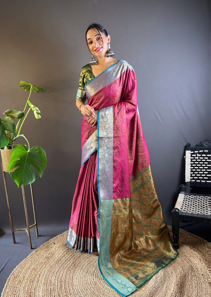 Pink Kashmiri Banarasi Saree With Unstitched Blouse