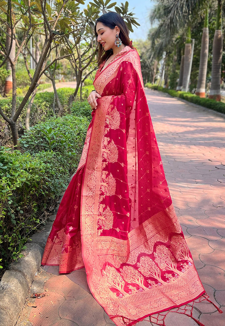 Expertly crafted with delicate details, our Organza Floral Rainbow Zari Woven Saree is a must-have for any saree lover. The small floral weaves all over the body give it a subtle elegance, while the rich dual zari pallu adds a touch of unique glamour. Paired with a Plain running Blouse, this saree offers both style and comfort.
