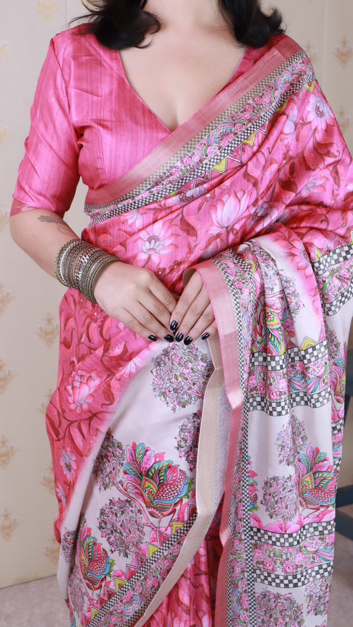 Made from wild silkworms, Tussar silk has a coarse texture and a dull gold sheen. Lightweight and breathable, often hand-painted or block-printed. Ideal for both casual and festive wear.