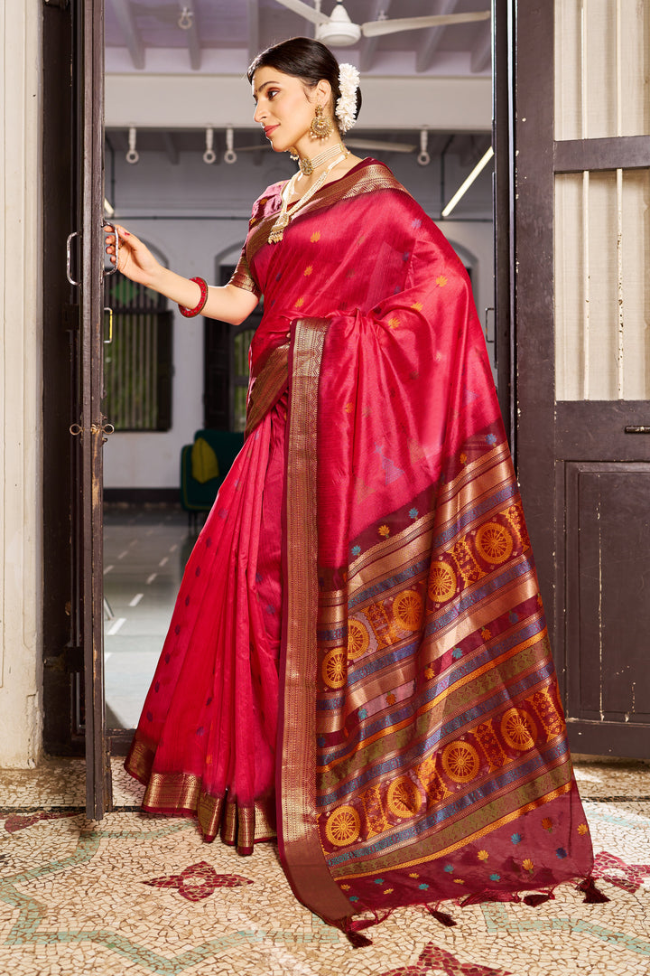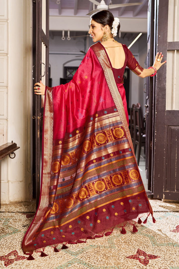 Natural, Slightly Coarse Texture: Raw silk sarees have a slightly uneven texture, which adds a unique character to the fabric. The threads may vary in thickness, giving it a handwoven, artisanal feel.