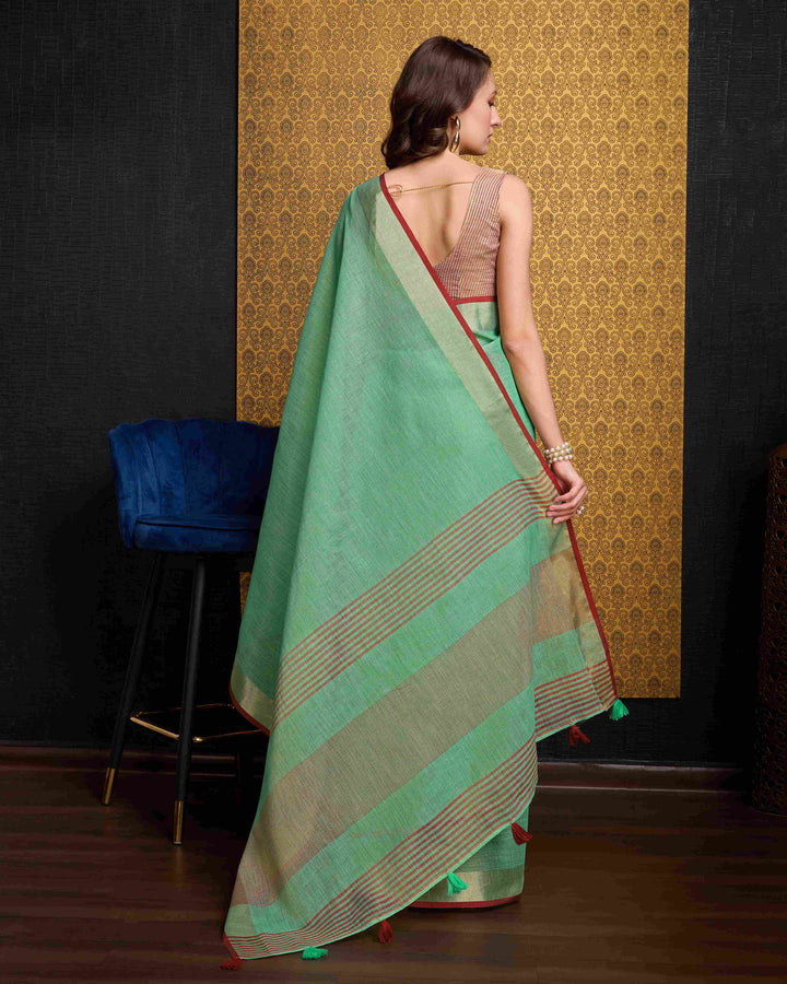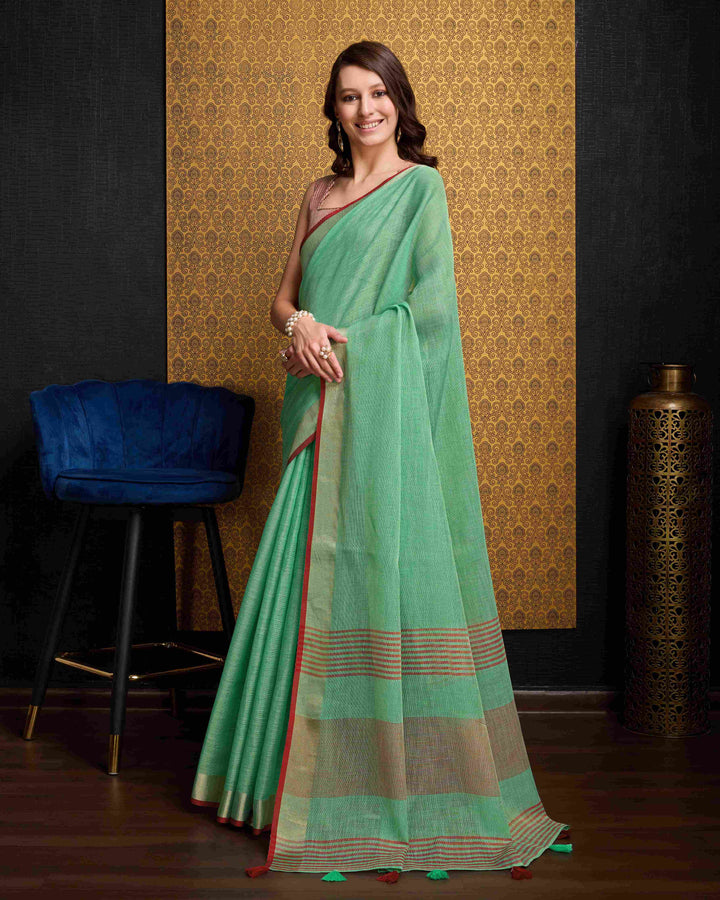 Linen sarees are available in plain, striped, and printed patterns, with some featuring beautiful embroidery or border work.