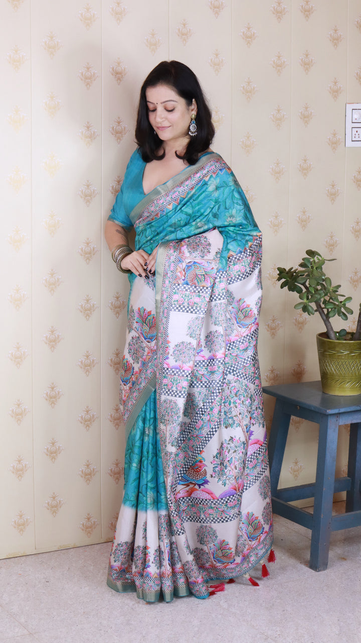 Turquoise Blue Tussar Silk Saree With Unstiched Blouse
