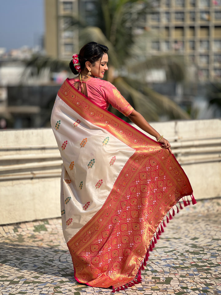 Flower Butta Design: Scattered floral motifs (buttas) all over the saree give it a minimal yet elegant appeal—can be woven in zari or colorful threads.