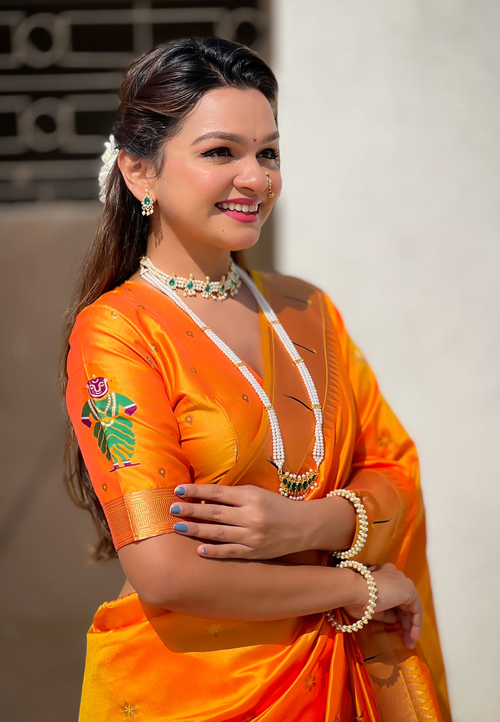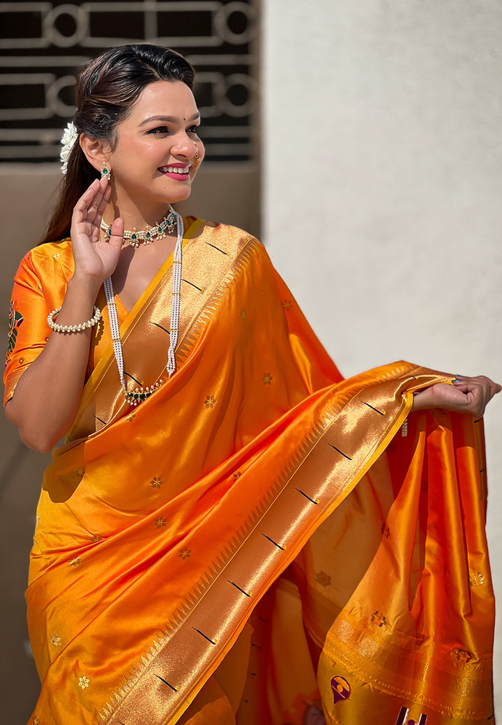 Soft Silk sarees with floral motifs weaves all over the body having Rich woven Paithani Vitthala pallu and muniya paithani border paired with brocade blouse same as shown.