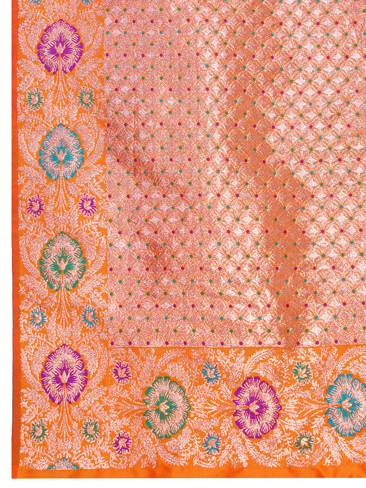 Crafted using intricate jacquard weaving techniques, this saree features woven patterns directly into the fabric. With its elegant texture and timeless appeal, it’s a favorite for traditional events and special gatherings.